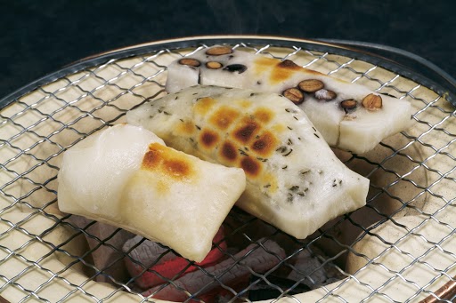 当社の品づくりのこだわりとして創業から受け継がれる「杵つき製法」。米粉ではなく丸粒のお米を使用し、その日に使う分のみを精米します。もち米を蒸しておこわを作り、杵で100回以上搗くことでコシが強く滑らかなお餅に仕上げています。日の出屋製菓では、9月から3月まで新大正もち米100%の「杵つき餅」を販売しております。